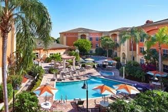 The Marriott Residence Inn Naples offers 120 guest suites, including 40 Two Bedroom Suites, 40 One Bedroom Suites and 40 Studio Suites. Hotel amenities include a market place, state of the art fitness center, business center with print options, lounge room, heated outdoor pool, hot tub, outdoor patio, tennis court, Free Full Hot breakfast buffet daily. In room amenities include full kitchens, flat screen TV's, and most rooms include a fireplace. Guests may also enjoy some additional services and amenities we offer such as complimentary beach chairs and umbrellas, grocery shopping and onsite concierge. Hotel is located 1 mile from the Gulf of Mexico Naples beaches; approximately 30 minutes to RSW. The hotel is centrally located in the Park Shore Area, Village Shops on Venetian Bay, Waterside Shops and Mercato. Pets welcome (fee applies).